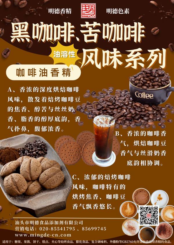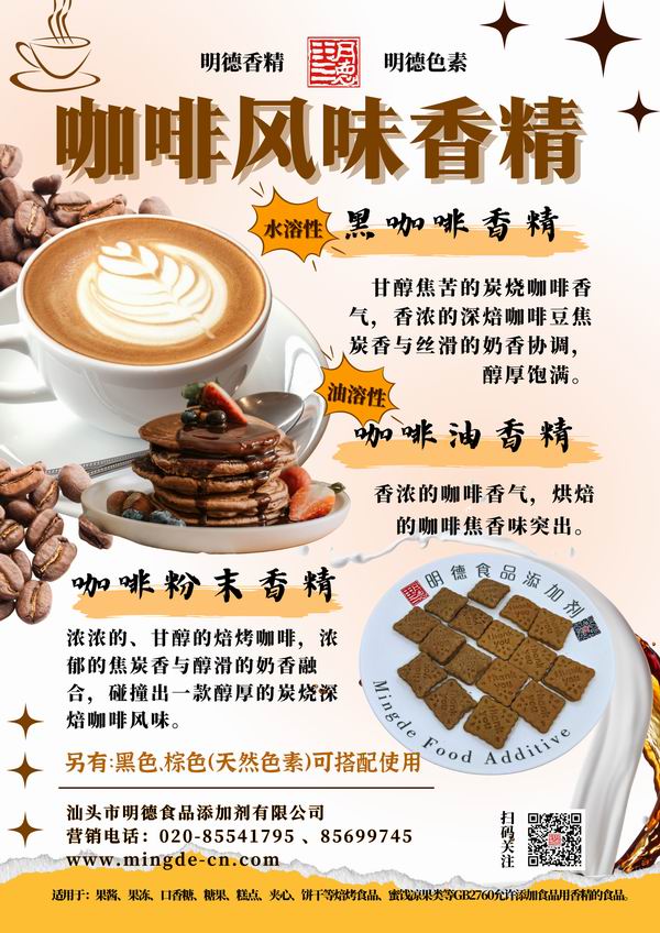 近年來,國內咖啡消費氛圍愈來愈濃,咖啡風味多元融入了各個領域,如 果凍、餅干、雪糕等,甚至應用于室內香氛等。順應市場潮流,提升味覺體驗。汕頭市明德食品添加劑有限公司不斷創(chuàng)新、潛心專研,當前我們擁有20余款咖啡相關風味的香精,供您選擇。并持續(xù)不斷創(chuàng)新,努力研發(fā)更多符合市場需求的風味。