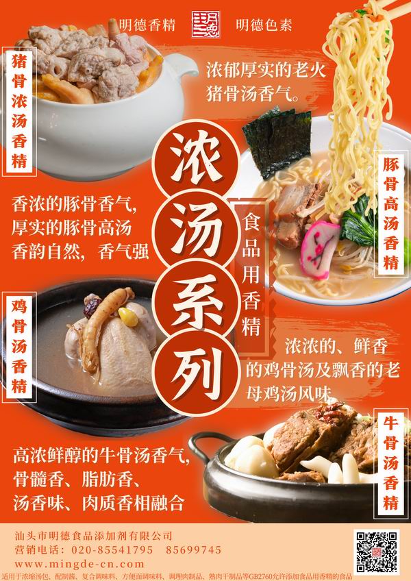 豬骨湯香精、大骨湯香精、豚骨湯香精,應(yīng)用在濃縮湯包、方便面調(diào)料包方面頗受歡迎,還能多方面應(yīng)用于調(diào)味料、醬料等產(chǎn)品為其提香,提高產(chǎn)品附加值,一定程度上降低生產(chǎn)成本。